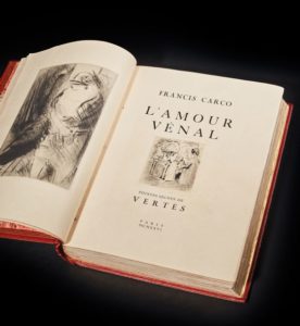 CARCO Francis / VERTES Marcel L'amour vénal. S.n. Paris 1926. Première édition illustrée de 43 pointes sèches de Vertès dont 16 hors-texte. Tirage limité à 95 ex., dont 16 ex. de tête sur Japon impérial après un unique ex. sur Japon ancien, celui-ci est un ex. de passe sur Japon impérial, numéroté H.C. Enrichi d'une aquarelle originale signée en coin supérieur droit par Vertès, 10x18,6 cm, et d'un envoi autographe signé de Carco, agrémenté d'un autoportrait à la cigarette, «à Robert Rolo, à l'ami des livres, ce livre d'un ami». Complet d'une suite sur japon impérial ou japon ancien, comprenant les illustrations du livre en différents états ou avec remarques, ainsi que des planches refusées. Reliure in-4 plein maroquin rouge, dos à 4 nerfs, lettrines or, date et lieu en pied, quatre piqûres sur le dos, discrètes, trois tranches dorées, contre-plats doublés et à encadrement de liserés or, couvertures et dos conservés, intérieur frais, ex-libris de G. Lévy, étui (reliure signée Blanchetière).