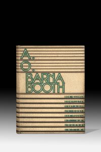 sur le premier plat, et le détail du titre en 8 lignes, doré sur des bandes de maroquin vert, doublure et gardes de maroquin vert clair orné de deux colonnes de lignes dorées, tranches dorées sur témoins, couverture et dos, chemise demi-maroquin orné du même décor que le dos du volume, étui (Paul Bonet). Édition originale. UN DES 30 PREMIERS EXEMPLAIRES RÉIMPOSÉS SUR VERGÉ D'ARCHES, seul tirage en grand papier. On a relié dans cet exemplaire un texte imprimé : Lettre de Valery Larbaud relative à Barnabooth, datée Casino d'Uriage, Isère, le 10 aout 1908. MAGISTRALE RELIURE ART DÉCO DE PAUL BONET, DANS LE GOÜT DES DÉCORATIONS ARCHITECTURALES DE L'ÉPOQUE.À la fin figurent le certificat du créateur, qui porte la date de la reliure, le 31 mars 1932 et cette remarque : En la composant, en choisissant les couleurs, j'ai pensé que comme tant d'autres bibelots, cette reliure eut peut-être amusé un instant barnabooth. Elle a été commandée par Raoul Simonson et est citée dans les Carnets (n° 202).
