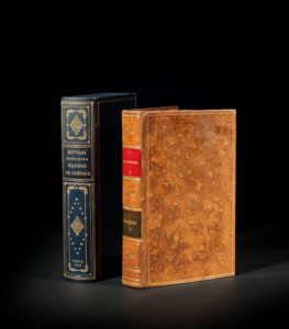 CHENIER André de Œuvres complètes d'André de Chénier. Foulon et compagnie libraires / Baudouin frères libraires Paris 1819. E.O. Ex. truffé d'un portrait de l'auteur monté sur onglet en frontispice, complet de la notice introductive d'Henri de LATOUCHE, également complet de «La jeune captive. Ode d'André de Chénier mise en musique par Vernier» et des pages de musique qui suivent. Reliure in-8 plein veau, plat à encadrement à la roulette or, dos lisse orné de fleurons or, pièce de titre sur cuir rouge pour l'auteur, vert pour le titre «Poésies», complet des couvertures originales bleues qui truffent l'exemplaire, ex-libris de Georges Degryse. Ensemble présenté dans un étui/boîte imitant un livre relié plein maroquin noir à longs grains, dos lisse orné d'un motif à étoiles, titré «Œuvres complètes d'André de Chénier» et daté, plat à encadrement d'un double liseré or.
