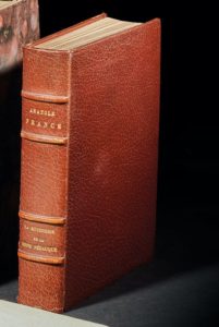 FRANCE Anatole La rôtisserie de la Reine Pédauque. Kra éditeur Paris 1925. Première édition illustrée par Guy de MONTABEL. L'un des 83 ex. sur papier Japon Impérial. Bien complet de la suite des illustrations sur Chine. Reliure doublée plein maroquin marron chocolat, contre plats de maroquin caramel, une charnière légèrement marquée, tête dorée, dos à 4 nerfs, couvertures conservées, étui (reliure signée Flammarion).