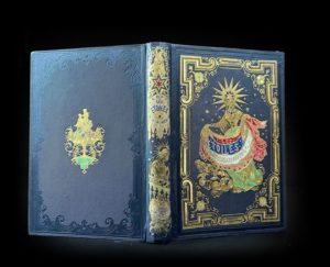 GRANDVILLE Jean Ignace Isidore Gérard dit & MÉRY Joseph Les Étoiles. Dernière féerie. [suivi de] FOELIX Comte : Les Étoiles. Astronomie des dames. G. de Gonet, Martinon Paris ; Leipzig, Charles Twietmeyer, s.d. [1849]. Deux parties en 1 vol. in-8, [2] ff., XVI-252 pp., [2] f., 186 pp., [1] f. Percaline bleue foncé à beau décor or et polychrome, reprenant au premier plat l'illustration “l'étoile du berger”, au second plat, un ovale étoilé rayonnant, le dos s'inspirant du dessin “l'étoile du soir”, tranches dorées (reliure de l'éditeur, plaque de Haarhaus). Quasi dénué de rousseurs.