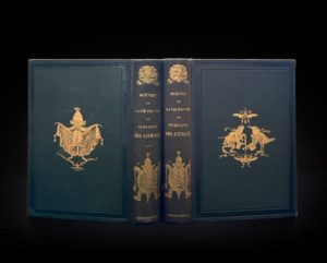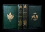 GRANDVILLE Jean-Jacques, STAHL P.-J., BALZAC Honoré, BAUDE L., JANIN J., NODIER Charles, SAND George Scènes de la vie privée et publique des animaux. J. Hetzel et Paulin Paris 1842. Ill. par Grandville. Deux volumes grand in-8. Reliures éditeur en PLEIN GHAGRIN VERT ornées de plaques spéciales réalisées d'après les dessins de Grandville pour la couverture du tome II. Le dessin original pour la plaque apposée sur les premiers plats, montrant en partie une grenouille et un oiseau se saluant mutuellement, est reproduit par Sophie Malavieille dans «Reliures et cartonnages d'éditeur en France au XIXe siècle, p. 125». Fers animaliers aux angles. Dos lisses ornés de fers animaliers. Tranches supérieures dorées. Très beau livre illustré par Grandville comprenant deux frontispices, 199 planches et de nombreuses vignettes gravées sur bois dans le texte. Edition originale de ce livre célèbre rédigé sous la direction de l'éditeur Hetzel, sous le pseudonyme de Stahl, avec la collaboration de Balzac, Janin, Nodier, George Sand, A. et P. de Musset, etc. Splendides reliures en plein chagrin vert aux ors coruscants! Intérieurs d'un blanc immaculé. Rarissime dans cette condition.