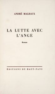 Malraux (André). La Lutte Avec L'ange. Roman. Yverdon, Éditions du Haut-Pays, 1943. Grand in-8, maroquin bordeaux, quadruple filet à froid encadrant les plats, dos à nerfs orné de même, doublure et gardes de daim gris, tête dorée, tranches...