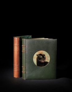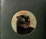 Reliure in-4 plein maroquin vert sombre, sur le premier plat un laque en médaillon signé Jean DUNAND représentant, en couleurs, la tête de Bagheera, la célèbre panthère noire du livre, dans la jungle, 13,5 cm de diamètre, dos à 4 nerfs, contre-plats doublés d'un plein maroquin vert plus clair encadré d'un liseré or, trois tranches dorées, pages de garde imitant les écailles d'un serpent, intérieur frais malgré quelques décharges, couvertures et dos conservés, sous chemise et étui demi maroquin vert à bandes, dos uniformément passé marron (reliure signé Cretté successeur de Marius Michel).