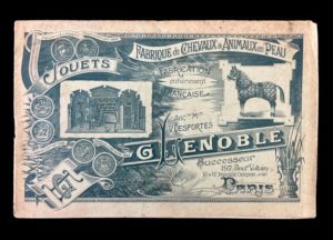 [JOUETS]. Fabrique de cheveux et animaux en peau. Fabrication entièrement française. Ancienne maison V. Desportes, G. Lenoble successeur. S.l. (Paris), s.d. (vers 1910). E.O. avec nombreuses illustrations dans le texte, une vignette découpée au f. [3]. Broché in-12 oblong (16 x 24,5 cm), sous couverture illustrée.