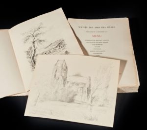 LA VARENDE Jean de Les côtes normandes. Société des amis du livre Paris 1954. E.O. L'un des 90 ex. sur Arches, seul grand papier (exemplaire de Henri HUSSENOT-DESENONGES et de Michel HERBERT). Illustrations de Aymar de LEZARDIERE. Exemplaire comprenant une partie du manuscrit (chapitre Les provinces de France) et une page tapuscrite du manuscrit, un dessin original au crayon signé, les différents menus de présentation de ce livre, 3 cartes de vœux signées de Aymar de Lézardière avec des dessins gravés, 4 textes autographes de Michel HERBERT, le compte rendu avec corrections manuscrites de l'A.G. de la Société des amis du livre pour la diffusion aux membres de cet ouvrage, une lettre autographe signée de Aymar de Lézardière et 3 photos de La Varende et Herbert dans la librairie de ce dernier. Bien complet de la suite des illustrations en différents états. En feuilles in-4 sous double chemise, l'une pour le livre et l'autre pour la suite.