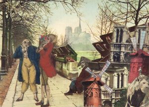 Prévert (Jacques). Collage original sur une carte postale en couleurs : Paris - Les Bouquinistes du quai de la Tournelle, avec au fond la cathédrale Notre-Dame de Paris. Au verso, petite fleur gouachée en noir, vert et rouge portant les signatures...