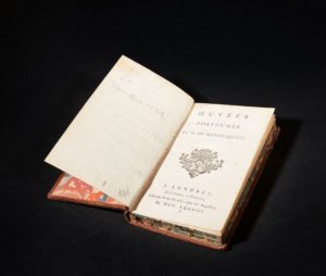 MONTESQUIEU Charles-Louis de Secondat baron de la Brède et de Œuvres posthumes. De Bure fils aîné, édité à Londres et se trouve à Paris 1783. E.O. de ce volume comprenant dans l'ordre : Arsace et Isménie (qui avait paru séparément la même année), Discours prononcé à la rentrée du Parlement de Bordeaux (paru en 1725) ; Réflexions sur les causes du plaisir qu'excitent en nous les ouvrages d'esprit et les productions des Beaux-Arts (E.O.) ; Ebauche de l'éloge historique du maréchal de Berwick (E.O.). Complet de la page des errata. Reliure in-12 plein veau, deux petites taches sur le premier plat, petits trous de vers sur le deuxième plat, dos lisse orné de dorure, dos lisse orné de dorures, pièce de titre sur cuir rouge, dos frotté et manque en coiffe, trois tranches jaspées, intérieur frais.
