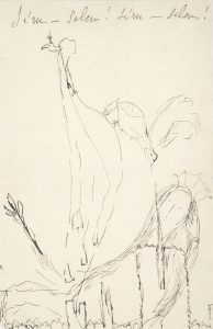 onirique assez étrange, fut, très probablement, adressé par Proust à son grand ami le compositeur Reynaldo Hahn, auquel il adressait des lettres qu'il illustrait. Tracé à l'encre, il représente, sur fond de cathédrale gothique, une Vierge couronnée endormie, tenant un rameau, et dont les longs cheveux enlacent celle-ci ainsi que la petite ville esquissée au bas du feuillet. A l'arrière-plan s'élèvent les silhouettes filiformes de paons-girafes. En haut, Proust a écrit : Jéru-salem ! Jéru-salem ! Composition à rattacher à l'intérêt passionné de Proust pour le Moyen-Âge. Il traduira en 1904 La Bible d'Amiens de Ruskin.