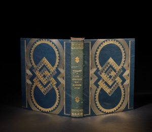 POE Edgar Les aventures de Gordon Pym. Alexis Redier éditeur Paris 1930. Première édition illustrée par André COLLOT, traduction de Charles BAUDELAIRE. Tirage limité à 301 ex., l'un des 210 ex. sur Arches. Reliure in-4 plein maroquin noir, grand décor géométrique or sur les plats, dos lisse légèrement insolé, orné de motifs géométriques or, tête dorée, couvertures et dos conservés, étui reliure signée Kieffer.