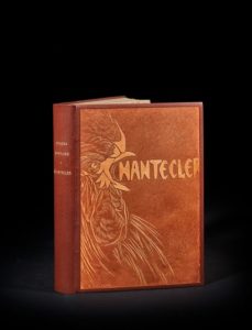 ROSTAND Edmond Chanteclerc. Charpentier et Fasquelle éditeurs Paris 1910. E.O. L'un des 100 ex. de tête sur Japon Impérial. Superbe reliure grand in-8 plein maroquin marron foncé, premier plat avec incrustée la célèbre couverture en cuir repoussé à froid, réalisée par René LALIQUE et représentant un coq criant «Chantecler», dos lisse, tête dorée (reliure signée Goy et Vilaine).