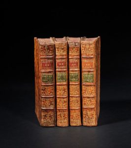 ROUSSEAU Jean-Jacques Emile ou de l'éducation. Chez Jean Néaulme Amsterdam 1765. Complet des 4 volumes in-12, plein veau, dos à 5 nerfs ornés de dorures, pièces de titre sur cuir rouge et vert, trois tranches jaspées, frottements et manques en coiffe des tomes I, III et IV, dos du TI assombri, amorce de fente en charnière du premier plat du TI, intérieur frais.