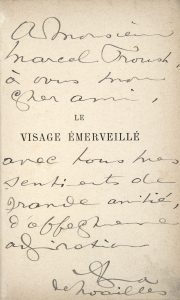 blanc et vert, filets dorés, tête dorée, non rogné, couverture et dos (Huser). Édition originale. PRÉCIEUX EXEMPLAIRE enrichi de ce bel ENVOI : A Monsieur Marcel Proust, à vous mon cher ami, LE VISAGE ÉMERVEILLÉ avec tous mes sentiments de grande amitié, d'affectueuse admiration Anna de Noailles