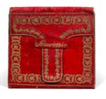 Portefeuille. Chagrin rouge brodé de fil doré à décor de volutes et de feuillages, le nom "Marie Terese de France" brodé au centre du premier plat et sur la languette de fermeture, le mot "Souvenir"; deux poches à soufflets intérieures, doublées de soie bleue, la même soie recouvrant un carnet retenu par un ruban, composé de 4 feuillets de papier fort, étui à crayon (145 x 145 mm). Cuir frotté, avec quelques petits manques intérieurs.