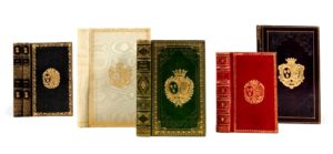 GENLIS, Madame de. Le comte de Corke, surnomme le Grand […]. Troisième édition. Paris, Maradan, 1811. 2 volumes in-12. Maroquin bleu à long grain, roulette dorée en encadrement, armes dorées, dos lisse orné, roulette intérieure, doublure et gardes de tabis rose, tranches dorées (Reliure de l’époque). Provenance : duchesse de Berry (Bibliothèque de Rosny, catalogue 1837, n° 301).