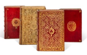 Office de la semaine sainte à l’usage de la Maison du Roy… Paris, Colombat, 1741. In-8. Maroquin rouge, plats ornés d’un abondant décor doré d’entrelacs, armes dorées, dos à nerfs orné, roulette intérieure, tranches dorées (Reliure de l’époque). Papier parfois jauni.