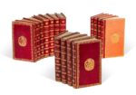 En 11 volumes in-12. Maroquin rouge, armes dorées, roulette dorée, dos lisse orné, roulette intérieure, doublure et gardes de tabis vert émeraude, tranches dorées (Bradel, signature en pied du dos).
