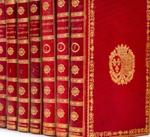 PORTER, Jane. Le Coin du feu du pasteur. Traduit de l’anglais par Mme Elisabeth De Bon. Paris, H Nicolle, 1817. 4 volumes in-12. Demi-maroquin rouge à long grain, plats de papier rose avec roulette dorée, armes dorées, dos orné (Reliure de l’époque). Coins très légèrement émoussés. Édition originale de la traduction française, parue la même année que l’édition originale anglaise.