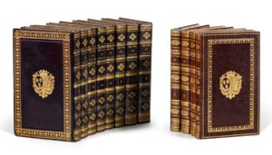 4 volumes in-8. Maroquin prune à long grain, roulette à froid et filet doré en encadrement, armes dorées de la duchesse de Berry au centre des plats, dos à nerfs orné, roulette intérieure, tranches dorées (Simier r. du roi, signature en pied du t. I).