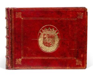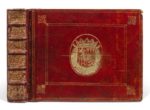 Petit in-4 oblong (146 x 190 mm). Maroquin rouge, plats ornés d'un décor à la Du Seuil, fleurons d'angle, armes dorées, dos à nerfs orné, tranches dorées (Reliure de l’époque). Mors et dos restaurés, coins frottés, rousseurs.