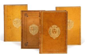 4 minces volumes in-8. Maroquin citron à long grain (havane pour Scribe), armes dorées, roulette dorée en encadrement (Scribe : roulette à froid et filets noirs), dos lisses, tranches dorées (Reliure de l’époque). Rousseurs éparses.BOIELDIEU, Francois-Adrien. La Fête du village voisin, opéra-comique en 3 actes. Paris, Vente, 1816. Premier plat taché. Livret de Sewrin pour l’opéra de Boieldieu, joué le 26 juin 1818 pour le mariage du duc de Berry. Provenance : Duchesse de Berry (armes). — Eugène Aubry-Vitet (ex-libris).