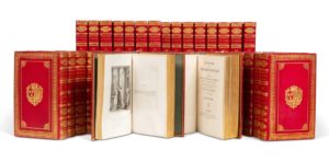 ─ Répertoire du théâtre français… Paris, Foucault, 1819-1820. 35 volumes (respectivement 23, 4 et 8) in-8 (203 x 126 mm). Maroquin rouge à long grain, roulette dorée et à froid en encadrement, filet doré en encadrement intérieur avec fleurons d’angle, armes dorées, dos à nerfs orné de fers dorés, roulette intérieure, tranches dorées (Reliure de l’époque attribuable à Simier). Rousseurs éparses, plusieurs figures (état définitif) uniformément brunies. Faux-titre et titre du dernier volume brunis. Petites usures d’usage sans gravité. Dos parfois très légèrement passés.