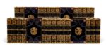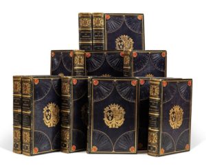 Paris, Ladvocat, 1822-1823. 25 volumes grand in-8 (255 x 143 mm). Maroquin bleu nuit à long grain, larges éventails aux angles avec fleurons mosaïqués rouges, armes dorées, dos à nerfs orné de fleurons, roulettes dorées, petits fers mosaïqués, roulette intérieure, tranches dorées (Simier, étiquette à son adresse rue St Honoré, 152).