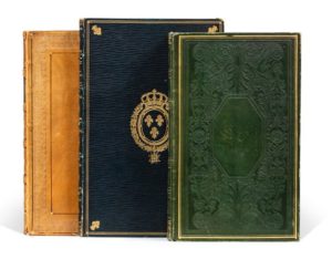 [ROCHEMORE Anne-Joaquim Joseph, marquis de]. Cérémonial pour la remise, la réception et le séjour de Madame la Duchesse de Berri à Marseille et son voyage à Toulon. [Marseille, Ricard, 1816]. In-8. Maroquin bleu nuit à long grain, armes dorées, fleurs de lys aux angles, dos à nerfs orné de fleurs de lys, roulette intérieure, tête dorée (Reliure postérieure). Petits frottements, un coin cassé, quelques rousseurs. Relation, par le maître des cérémonies, de l'arrivée en France de Marie-Caroline de Bourbon-Sicile, future épouse du duc de Berry. C'est le programme des journées du 30 mai au 3 juin, donné quelques jours auparavant (le 27 mai). Enrichi d'un ravissant portrait anonyme de la Duchesse de Berry gravé en couleurs. Provenance : Gérard Souham (ex-libris ; 7 décembre 2009, n° 188).