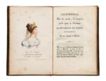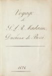 [Récit du voyage de la Duchesse de Berri en 1828] constitué de coupures de presse ou d'un journal imprimé. Premier feuillet manuscrit titré "Voyage de S.A.R. Madame la duchesse de Berry", titre collé et 79 feuillets numérotées à la plume avec les pages imprimées contrecollées. Petit in-4. Veau fauve, roulettes à froid et filets noirs en encadrement, dos à faux-nerfs plats orné, roulette intérieure (Simier R. du roi, signature en pied du dos). Ce recueil relate le voyage de propagande entrepris par la duchesse en 1828 afin de maintenir la ferveur monarchique. Partie d'Île de France, elle visita successivement la vallée de la Loire de Blois jusqu’à Nantes, une partie de la Bretagne (en passant par Vannes, Auray et Rennes), pour, enfin, se diriger vers Bordeaux et rejoindre le Béarn.