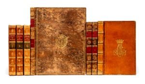 TUCKEY, James Kingston. Relation d'une expédition entreprise en 1816 [...] pour reconnoître le Zaïre, communément appelé le Congo, fleuve de l'Afrique méridionale… Paris, Gide fils, 1818. 3 volumes dont 2 in-8 et un atlas in-4. Veau raciné, roulette dorée en encadrement, armes dorées, dos à nerfs orné, pièces de titre et de tomaison de maroquin rouge, roulette intérieure, tranches marbrées (Simier R. du Roi). Quelques épidermures et frottements aux mors et coins. Petites piqûres aux feuillets liminaires. Première édition française. L’atlas compte 14 planches hors texte (portant 18 figures), certaines repliées et une grande carte du fleuve Zaïre. Tuckey embarqua en 1816 en compagnie de plusieurs autres savants anglais sur le Congo et remonta le fleuve jusqu'à plus de 280 miles à l'intérieur des terres. Il mourut durant l’expédition, ainsi que nombre de ses confrères, de maladie ou d'épuisement. Provenance : Duchesse de Berry (armes ; ex-libris Bibliothèque de Rosny ; catalogue 1837, n° 1435).