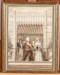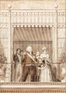 Henri Buguet Louis XVIII and the royal family on the balcony of the Tuileries, 1815| Louis XVIII et la famille royale se présentant au balcon des Tuileries, 1815 Plume et encre noire et brune, lavis gris et rehauts de blanc sur pierre noire dans des traits d'encadrement à l'encre noire. Signé et daté à la plume et encre brune en bas à droite Buguet 1815
