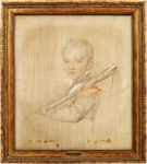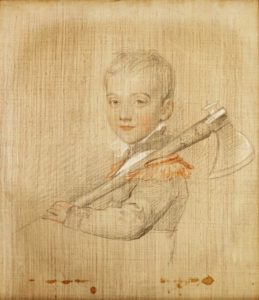 Envoyé en France par le roi George IV d’Angleterre en 1825 pour réaliser le portrait du roi de France, Sir Thomas Lawrence exécute pendant ce même séjour le portrait de la duchesse de Berry dont nous présentons une copie (voir lot 615). C’est probablement également à cette occasion que le peintre anglais réalise ce portrait du duc de Bordeaux portant une hâche.