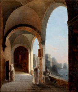 Parmi les témoignages de son œuvre peint, cette toile signée et datée M C fecit 1854 illustre le quotidien de Frères dans la chartreuse de San Giacomo à Capri. Le caractère intimiste de cet intérieur médiéval créé un univers isolé, méditatif dans lequel les personnages évoluent presque hors du temps.