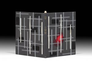 grille à travers laquelle de noirs rectangles parsemés apparaissent mosaïqués de maroquin déchiré non sertis, le premier plat mosaïqué d'un grand astre rougeoyant de maroquin également non serti, dos lisse orné de la date, du titre et du nom de l'auteur en capitales dorées, doublure et gardes de daim écarlate encadrées d'un listel de box gris bleuté, tranches dorées sur témoins, couverture et dos, chemise et étui (Paul Bonet, 1967). Édition originale. Tirage à 50 exemplaires. UN DES 6 PREMIERS EXEMPLAIRES RÉIMPOSÉS SUR VIEUX JAPON (n° 1) signés par Reverdy. SEULE RELIURE DE PAUL BONET SUR CE TEXTE. Elle figure dans les Carnets (n° 1577). Bonet l'a exécutée pour lui-même. Elle porte son ex-libris, doré au contreplat, et figure au catalogue de sa bibliothèque personnelle (22 et 23 avril 1970, n° 354).