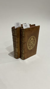 de l’époque). Réunion des livraisons de mai à août 1686 et de septembre à décembre 1686. Une coiffe de pied accidentée ; mors fendillés et même fendus en tête et en pied ; légères taches sur les plats, mais EXEMPLAIRE ORNÉ DES ARMES DE JACQUES AUGUSTE DE THOU (1553-1617) ET DU CHIFFRE COMPOSÉ du bibliophile et de sa femme, Gasparde de La Chastre, appliqués par son fils.