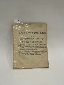 [MONTPELLIER]. Avertissemens de Monseigneur l’Evêque de Montpellier, addressés au chapitre de sa Cathedrale, pour le porter à reformer un Abus introduit depuis quelques tems parmi les Musiciens de cette Eglise […]. Montpellier, De...