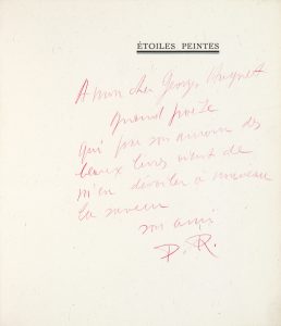 exemplaires. UN DES 12 EXEMPLAIRES SUR CHINE comportant L'EAU-FORTE ORIGINALE EN DOUBLE ÉTAT, EN NOIR SUR CHINE, ET EN BISTRE SUR JAPON. Ces 12 exemplaires sur papier de Chine ont été souscrits par la librairie Ronald Davis. Envoi autographe signé au crayon rose : A mon cher Georges Hugnet grand poète qui par son amour des beaux livres vient de m'en dévoiler à nouveau la saveur son ami, P. R.