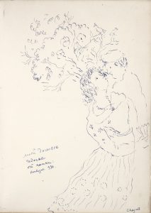 d'Ida, fille de Marc Chagall enrichi d'un envoi autographe en russe, accompagné d'un beau DESSIN ÀL 'ENCRE SIGNÉ DE MARC CHAGALL, à pleine page, il est daté Boulogne [1]930. L'envoi peut se traduire ainsi : à ma fille chérie Idoutchka, de la part de son papounet.