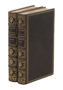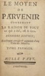 Nulle part, [Hollande], 100070039 [1739] ; 2 vol. petit in-12 de [8] ff., 363 pp. ; [1] f., 364 pp., maroquin brun, trois filets dorés en encadrement, dos à nerfs ornés, dentelle intérieure, tranches dorées (Amand).« Le Moyen de parvenir est un répertoire de petits contes joyeux et de quolibets auxquels ont amplement puisé non seulement Tabarin et le pseudo-Bruscambille, mais encore d’Aubigné dans son Baron de Faeneste, et Sorel dans son Francion » (Brunet).