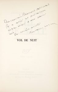 ENVOI AUTOGRAPHE SIGNÉ À RAYMOND GALLIMARD, frère de Gaston, responsable commercial et financier des Éditions Gallimard dès 1920 : Pour Monsieur Raymond Gallimard qui a aimé les peurs de mon métier et qui a vécu parmi eux. En sincère amitié. Antoine de Saint-Exupéry.