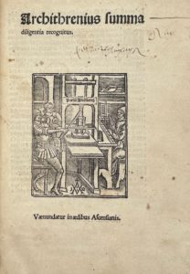 Belle et célèbre vignette de Josse Bade gravée sur bois (un atelier d’imprimerie), nombreuses lettrines décorées.