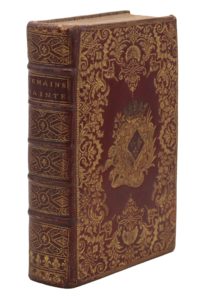 Paris, Jacques Guérin, 1751 ; in-8, maroquin rouge, les plats ornés d’une grande plaque dorée de Dubuisson, armes au centre, dos à nerfs orné, tranches dorées, gardes de papier d’Augsbourg. Bel office imprimé pour la maison des filles de Louis XV.