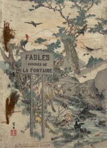 Tokyo et Paris, Flammarion et Tsoukidi, 1894 ; 2 vol. in-8 cousus à la japonaise avec cordons de soie, couvertures illustrées (un peu salies). Célèbre édition des fables d’un auteur du XVIIe siècle illustrée par les meilleurs artistes japonais. Le livre est imprimé en couleurs sur papier crêpe. Il contient 28 compositions à double page plus celle des couvertures.