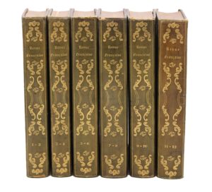 Paris, au bureau de la Revue française, 1837-1839 ; 12 tomes en 6 vol. in-8, reliures de l’époque demi-basane glacée verte, dos lisses ornés en long de motifs rocaille, tranches mouchetées. Très rare revue politique de la Monarchie de Juillet.