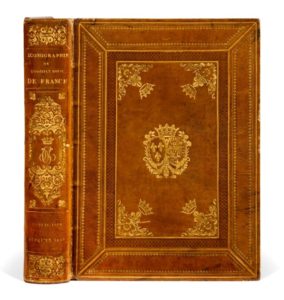 In-4 (345 x 260 mm). Maroquin lavallière, large encadrement de roulettes dorées et à froid avec fleurons d’angle surmontés d’une fleur de lys couronnée, armes dorées, dos lisse ornés de fleurs de lys et de fers dorés, chiffre MC couronné, encadrement intérieur, tranches dorées (Simier R. du Roi, signature en pied du dos).