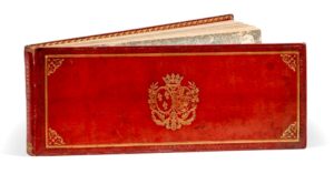 Paris, Chez Dauty et Desmaisons, [1820 ?]. In-12 oblong (255 x 90 mm). Veau cerise, palmettes à froid et filets dorés en encadrement, armes dorées, dos lisse, titre doré, tranches dorées (Simier r. du roi, signature en pied du dos). Étiquette de prix "seminarium meduntinum" au contreplat, daté en latin 17 août 182[6].