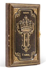 Grande carte dépliante (678 x 515 mm) contrecollée sur toile et rehaussée à l’aquarelle, pliée in-16 (138 x 90). Maroquin brun, plat supérieur orné du H couronné en laiton argenté dans un encadrement de filets dorés avec fleurons d’angle (Josef WolfGalanterie Buchbinder Gmunden).