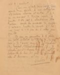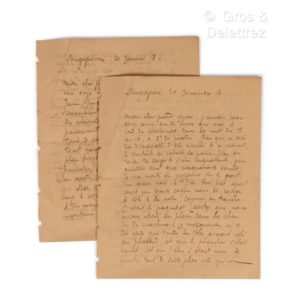 SEGALEN Victor (1878-1919) 2 L.A.S. à Yvon Segalen, Singapore, 20 décembre 1917 et 20 janvier 1918 Le 20 décembre, il raconte avec beaucoup de recul un accident maritime « à bord du Warrimoo dans la nuit du 15 au 16, à 2h du matin. [ ] J’ai entendu des coups de sirène inquiétants, puis aussitôt deux gros craquements sourds. Je suis monté en pyjama sur le pont [ ] j’ai fini par apercevoir une grosse coque noire et rouge à côté de la nôtre, comme en travers. C’était le paquebot Laertes que nous avions abordé en plein dans la chambre des machines. Le mécanicien m’a dit après que toutes les tôles avaient volé au plafond, et que le plancher s’était ouvert et que l’eau s’était mise à monter tout de suite plus vite qu’un homme ne grimpe. [ ] nous avions fait aussitôt machine en avant pour le pousser et le maintenir à flot, juste le temps et sauver l’équipage. Pendant ce temps on lançait des fusées de détresse. Quand tout l’équipage a été à bord, nous avons fait machine en arrière à toute vitesse pour nous dégager de l’autre. [ ] ». Il poursuit sur le naufrage du paquebot et sur les dégâts et conclut sur le sujet en indiquant « un abordage tout à fait bien réussi. ». Il poursuit sur les suites de cet abordage réussit, c’est-à-dire attribuer la responsabilité de l’accident, changement de bateau etc. Il indique « Les Chinois n’ont pas eu trop peur. Je crois qu’ils n’ont pas compris la gravité de l’accident [ ] ». ; Le 20 janvier, il annonce avoir encore du retard, « à cause des réparations et du mauvais temps. ». Il annonce le verdict du tribunal maritime (sur « l’abordage tout à fait réussi »). Il conclut sur la collection de timbre d’Yvon. Lettres inédites, provenance familiale.