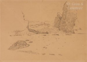 GAUGUIN Paul (1848-1903) Bord de mer en Bretagne. Dessin à la mine de plomb sur papier fin contrecollé sur carton (légère pliure au centre de la feuille). Haut. : 20,5 cm. ; Larg. : 30 cm. env. Circa. 1888-90. Dans cette étude représentant un paysage marin, Gauguin démontre toute son habileté dans l'art du dessin. Les formes stylisées, le recours aux hachures, et la composition par plans superposés sont typiques du rapport au paysage que l'artiste entretient durant les années 1888-1890. Cette approche se retrouve dans plusieurs œuvres de cette même période comme Rochers sur la côte (W. 288, musée de Pont-Aven), Rochers sur la côte bretonne (W. 289, collection particulière japonaise) ou encore la Vague (W. 303, collection David Rockefeller). Provenance : Ancienne collection Victor SEGALEN, puis par descendance. Exposition Paul GAUGUIN , Tokyo, 1968 n°46. Sous réserve d'obtention du certificat par le Wildenstein Plattner Institute, le 27 février 2024