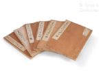 SHIMIZU SEIFU (1851-1913) et Nishizawa Tekiho (1889-1965): Unai no tomo Livre de jouets Six volumes sur dix (volumes 2/3/4/5/6). Couvertures brunes embossées. Edition 1911 Dim. 25 x 17,7 cm. On joint un volume inconnu de l'édition de 1891. couverture beige embossée. (Gaufrage et couleurs micacés) Dim. 25 x 17,7 cm.